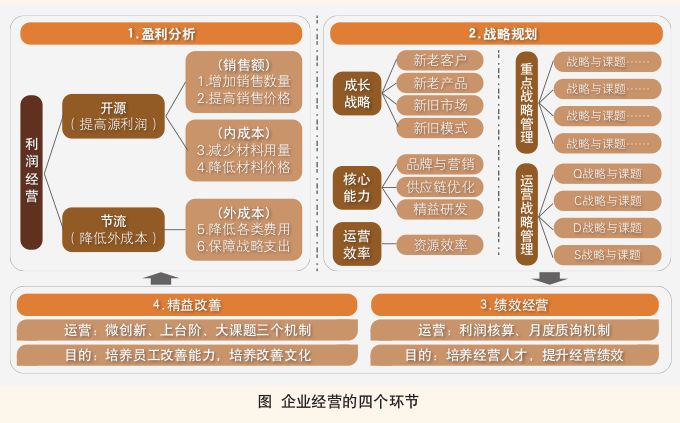 從邏輯思考和實現(xiàn)方式的角度,企業(yè)獲取利潤的流程都是一個閉環(huán),具體包括盈利分析、戰(zhàn)略規(guī)劃、績效經(jīng)營和精益改善等四個關(guān)鍵環(huán)節(jié)。