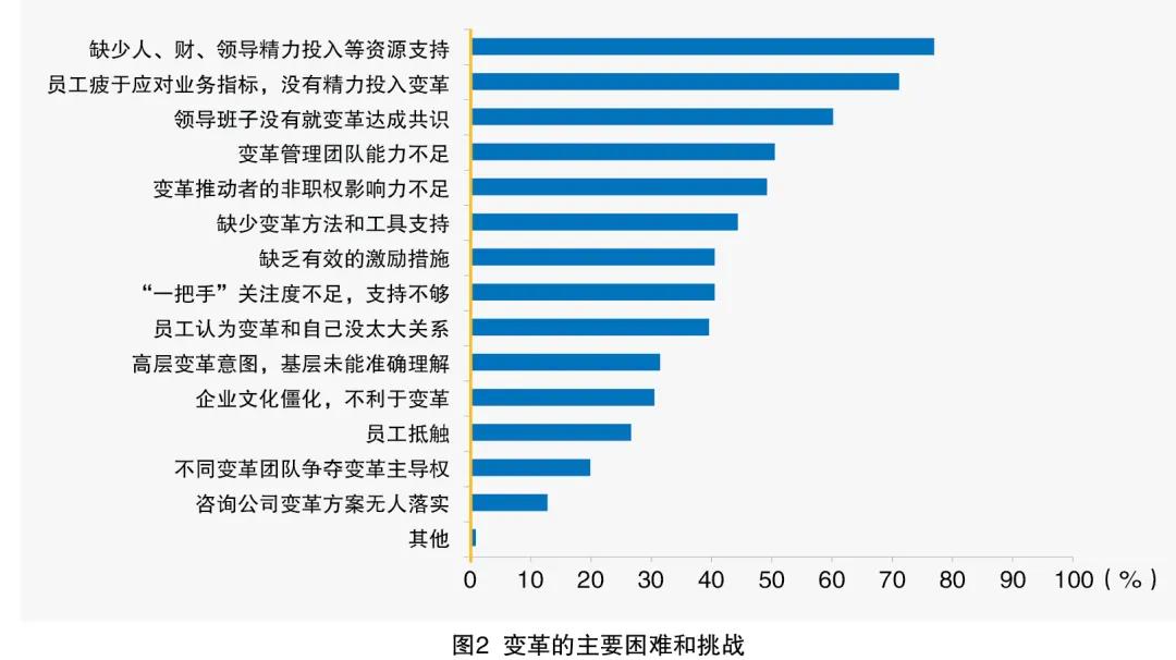 調(diào)研報告顯示,影響企業(yè)變革的主要困難和挑戰(zhàn)依次為(如圖2所示):