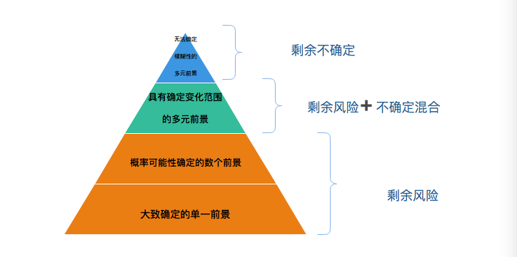我們認(rèn)為,以上四個層次中只有第四層才是真正意義上的不確定性或剩余不確定性,而前三層均屬于不同風(fēng)險性類別,并不屬于不確定性。換言之,風(fēng)險性是指,雖然無法完全確定未來情境,但可以大體預(yù)測前景的可能性范圍,即未來為部分可知,至少從統(tǒng)計學(xué)概率角度而言。不確定性則是指無法預(yù)見哪些前景可能發(fā)生,以及它們發(fā)生的可能性范圍,也就是說無法確認(rèn)統(tǒng)計學(xué)概率,即未來為完全不可知。