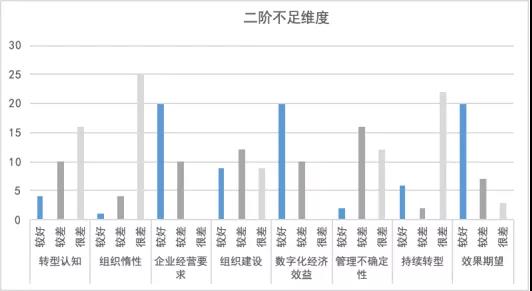 但是藍顏色最少的是哪方面呢?是對轉(zhuǎn)型必要性的認(rèn)知及轉(zhuǎn)型成效,這是一些痛點和短板。