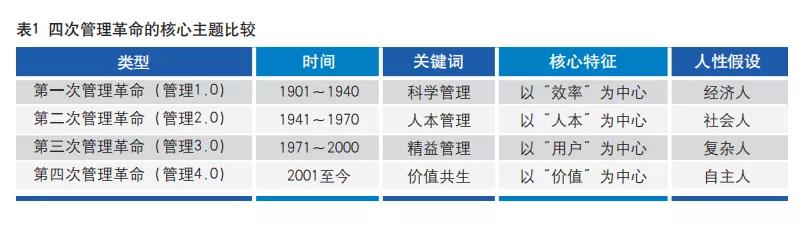 從“效率第一”到“價(jià)值第一”,管理學(xué)走過了一百多年的歷史,不斷推動(dòng)從“經(jīng)濟(jì)人”到“自主人”的跨越。見表1。