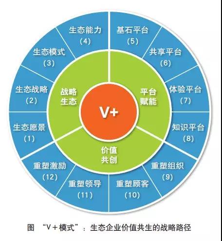 “V+模式”包括“一個(gè)中心、三個(gè)維度”,其中一個(gè)中心是指“以價(jià)值共生為中心”,三個(gè)維度是指戰(zhàn)略生態(tài)、平臺賦能和價(jià)值共創(chuàng),每個(gè)維度聚焦于價(jià)值共生中的一個(gè)核心問題。其中,“戰(zhàn)略生態(tài)”回答的問題是:創(chuàng)造什么價(jià)值?“平臺賦能”回答的問題是:能不能創(chuàng)造價(jià)值?價(jià)值共創(chuàng)回答的問題是:如何創(chuàng)造價(jià)值?