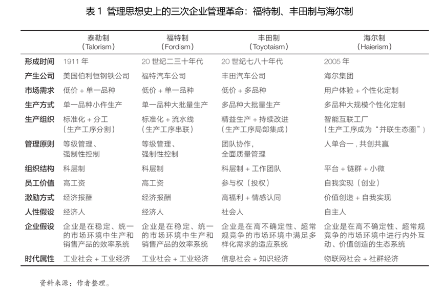 實(shí)踐是認(rèn)識(shí)的來(lái)源和歸宿。企業(yè)管理實(shí)踐是管理理論發(fā)展的源動(dòng)力和檢驗(yàn)標(biāo)準(zhǔn)。近代以來(lái)的管理思想史上,曾經(jīng)在管理思想演化與創(chuàng)新的過(guò)程中留下濃墨重彩之筆的企業(yè)有伯利恒(鋼鐵公司,貢獻(xiàn)了“泰勒制”)、福特(汽車(chē)公司,貢獻(xiàn)了“福特制”)、豐田(汽車(chē)公司,貢獻(xiàn)了“豐田制/后福特制”)。泰勒制、福特制與豐田制是整個(gè)20世紀(jì)管理思想演化的一條基本線(xiàn)索,展現(xiàn)了管理理論由分工原則到合作原則,由分析思維到整體思維演變的基本規(guī)律。通過(guò)審慎的比較研究發(fā)現(xiàn),海爾的“人單合一”管理實(shí)踐模式具備塑造和開(kāi)發(fā)新時(shí)代新管理理論范式的潛力與可能性。