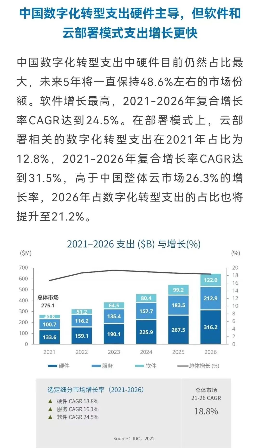 2022年,無論全球還是中國,超過50%的經(jīng)濟(jì)(中國約超60萬億元人民幣)是基于數(shù)字化或受數(shù)字化影響的,中國2022-2026年數(shù)字化轉(zhuǎn)型總支出將達(dá)到2.38萬億美元。