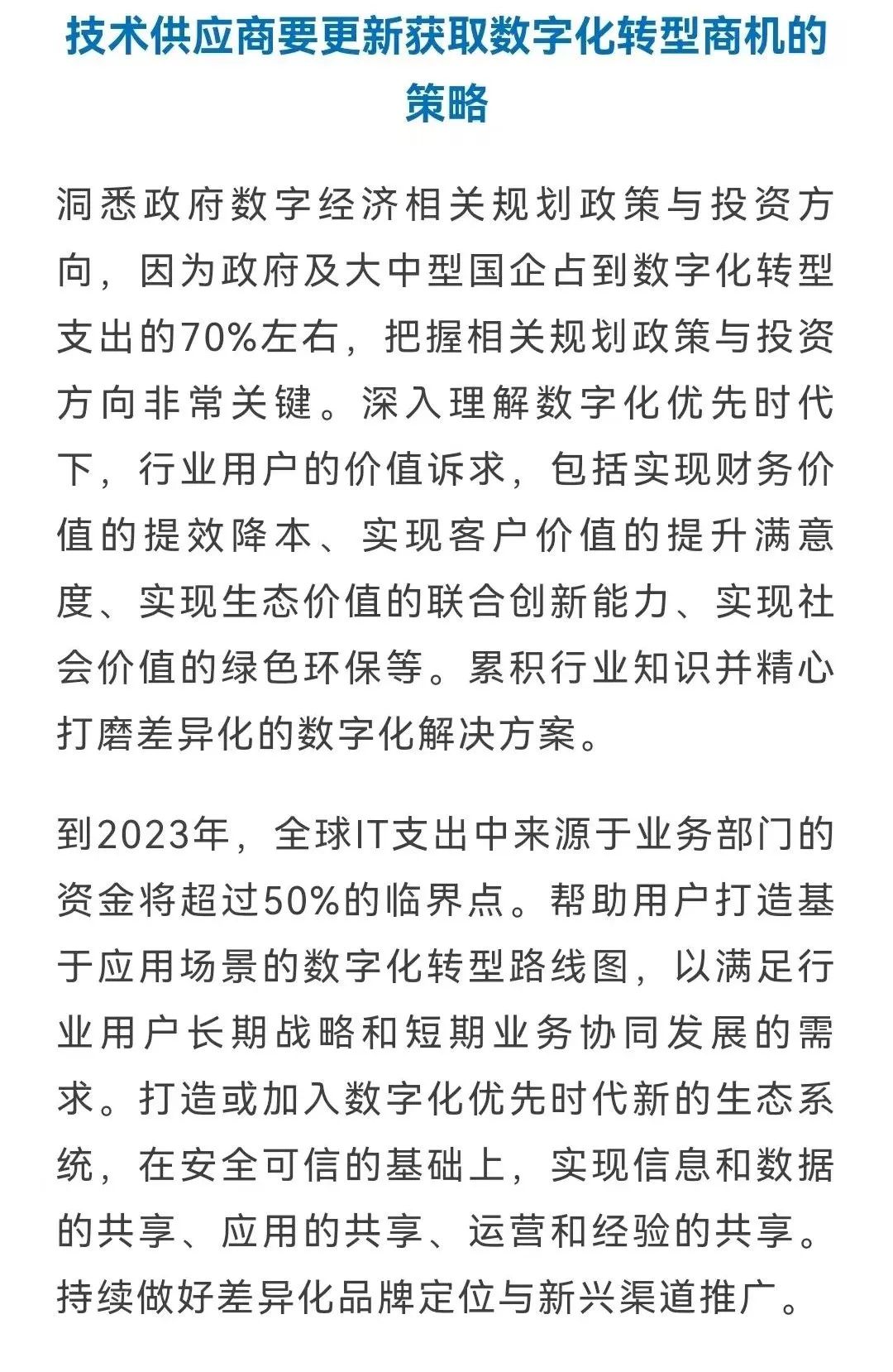 報告也分析了中國數(shù)字化轉(zhuǎn)型獨(dú)特的市場環(huán)境,包括數(shù)字化轉(zhuǎn)型特征、市場驅(qū)動因素、市場阻礙因素,并簡要分析了可能影響企業(yè)數(shù)字化轉(zhuǎn)型的三個重大市場變化。并為數(shù)字化轉(zhuǎn)型技術(shù)提供商更好地獲取商機(jī)給出了六大策略建議。