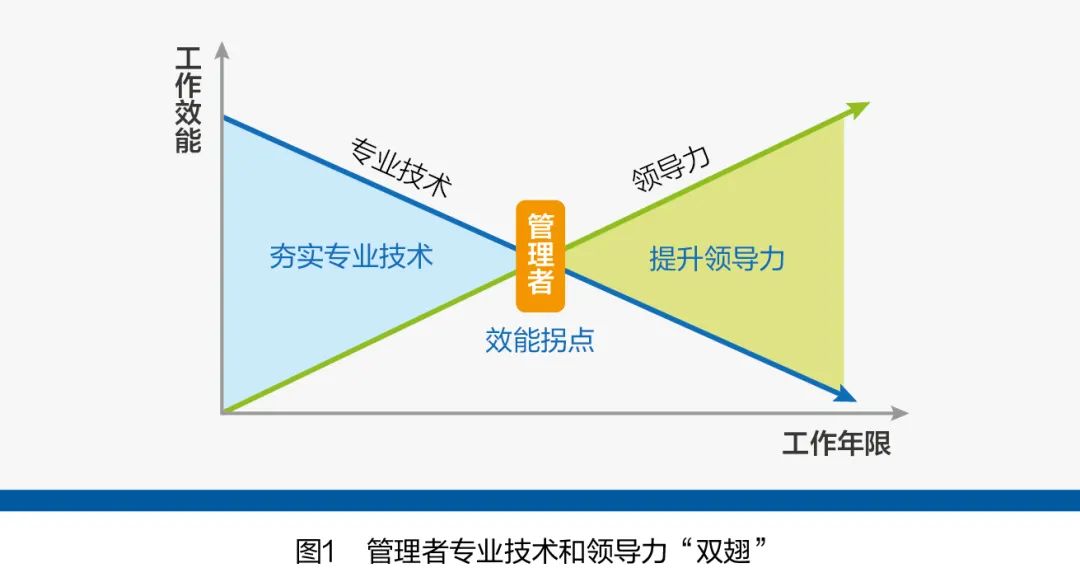 隨著工作年限增長和職位提升,員工的專業(yè)技術(shù)對工作效能的貢獻率逐漸降低,其領(lǐng)導(dǎo)力對工作效能的貢獻率則不斷提升,兩條效能線的交匯點是員工可能成為管理者的重要節(jié)點,如圖1所示。