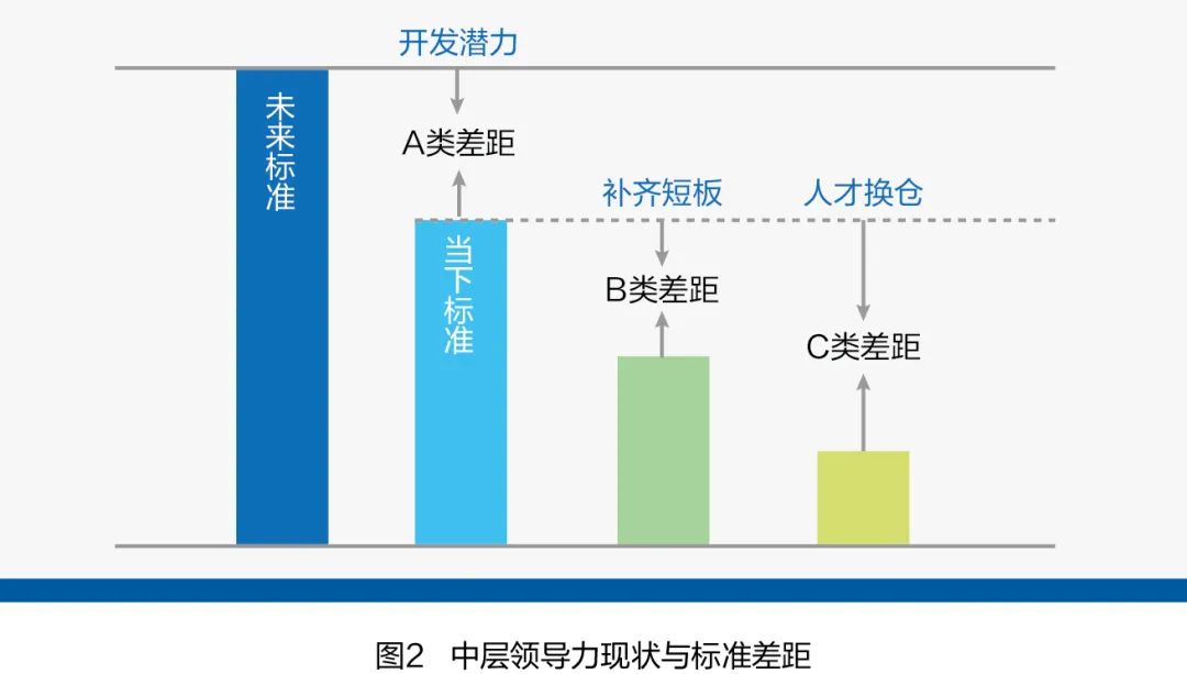 如圖2所示,根據(jù)“二八原則”,選擇20%左右績效好、潛力高的A類中層管理者納入關(guān)鍵人才后備梯隊,作為當下標準對標未來領(lǐng)導(dǎo)力標準(領(lǐng)導(dǎo)力模型),系統(tǒng)化提升領(lǐng)導(dǎo)力;對于70%績效良好但潛力一般的B類中層管理者,對標當下領(lǐng)導(dǎo)力標準,補齊短板即可;對于剩余10%績效差、潛力低的C類中層管理者,通過員工晉升或外部招聘,進行人才換倉。