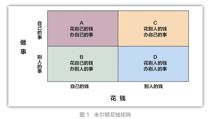 米爾頓教授認(rèn)為,如果以“花錢”和“做事”作為兩個(gè)維度去分析人們的行為,會出現(xiàn)以下四種情況(見圖1)。