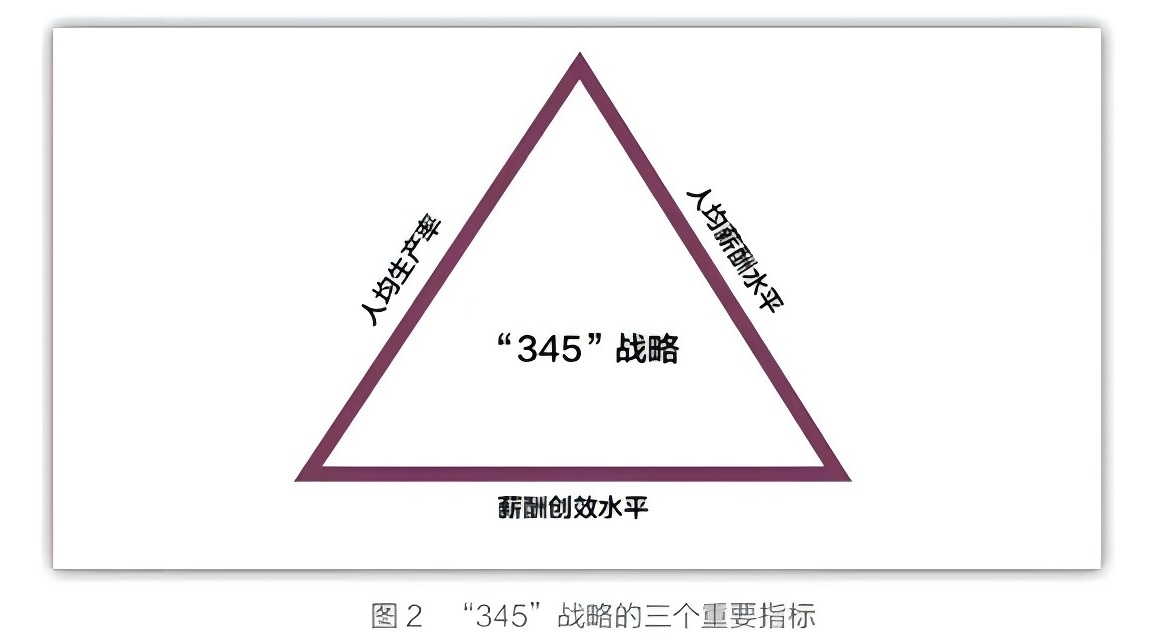 理念要轉(zhuǎn)變成實(shí)實(shí)在在的行動,首先必須完成從理念到指標(biāo)的解碼?!?45”包括了三個(gè)重要指標(biāo):①人均生產(chǎn)率。3個(gè)人干5個(gè)人的活,意味著人均生產(chǎn)率增長66.7%。②人均薪酬水平。3個(gè)人拿4個(gè)人工資,意味著人均薪酬水平增長33.3%。③薪酬創(chuàng)效水平。4個(gè)人的工資換來了5個(gè)人的活,意味著每花一塊錢的薪酬,創(chuàng)造的價(jià)值增長了25%。這三個(gè)指標(biāo)之間,形成了一個(gè)有意思的“三角關(guān)系”(見圖2)。