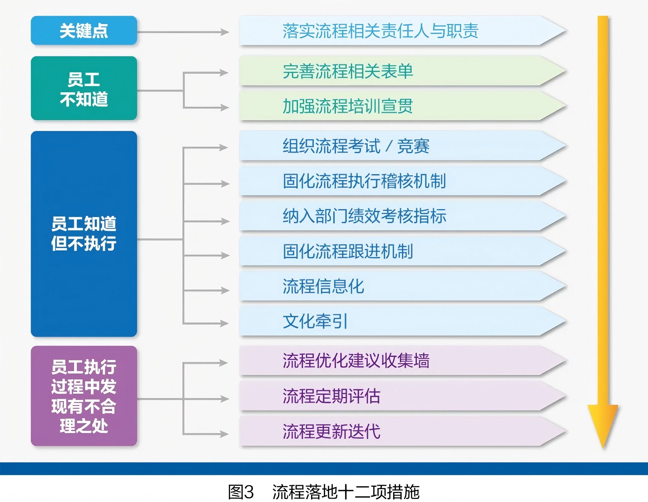 完成上述動(dòng)作后,為確保企業(yè)流程落地,管理者可以從關(guān)鍵點(diǎn)、員工不知道、員工知道但不執(zhí)行、員工執(zhí)行過(guò)程中發(fā)現(xiàn)流程有不合理之處四個(gè)維度入手,細(xì)化為十二項(xiàng)措施,如圖3所示。