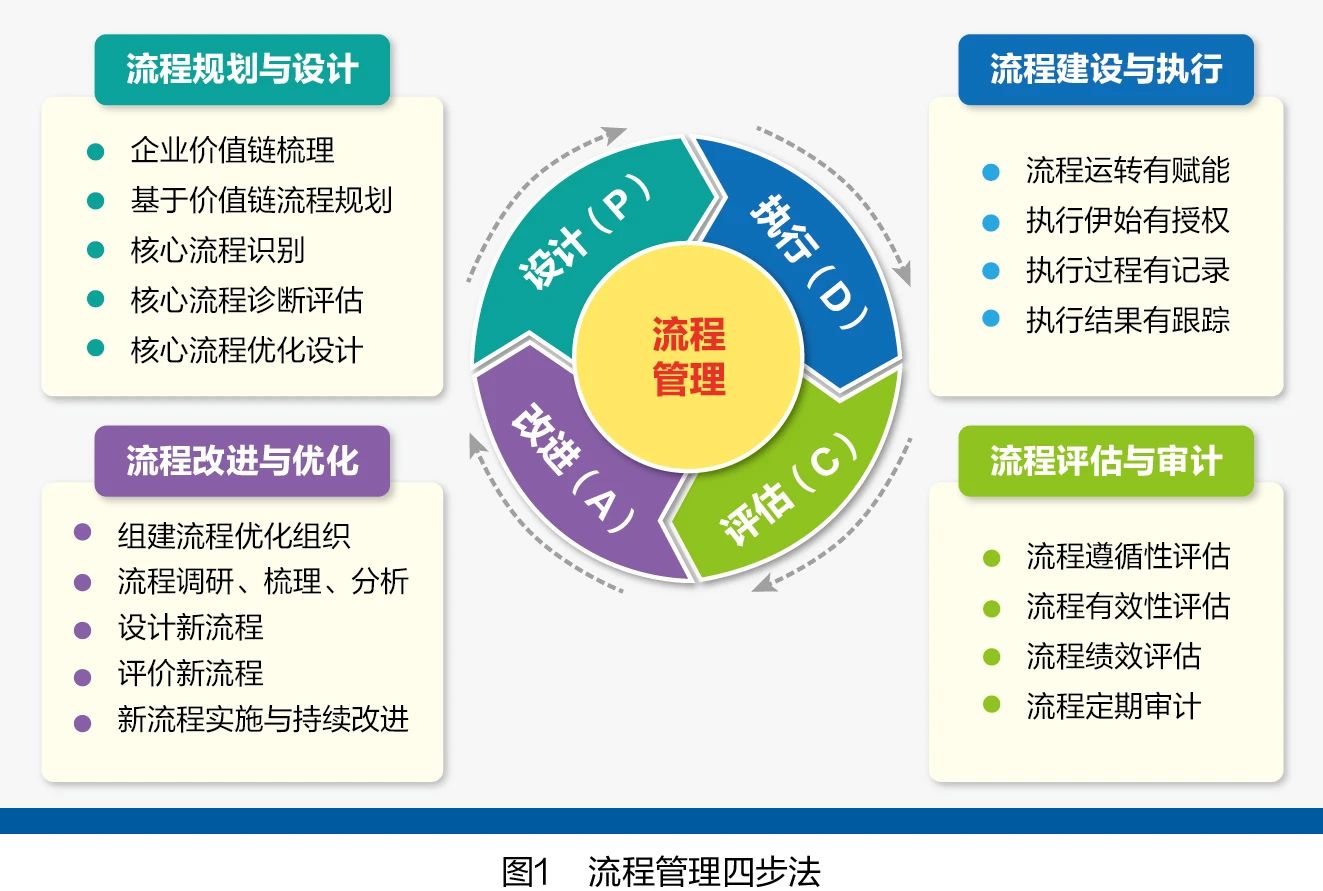 流程管理四步法由設(shè)計(jì)、執(zhí)行、評(píng)估、改進(jìn)組成一個(gè)完整循環(huán),如圖1所示。